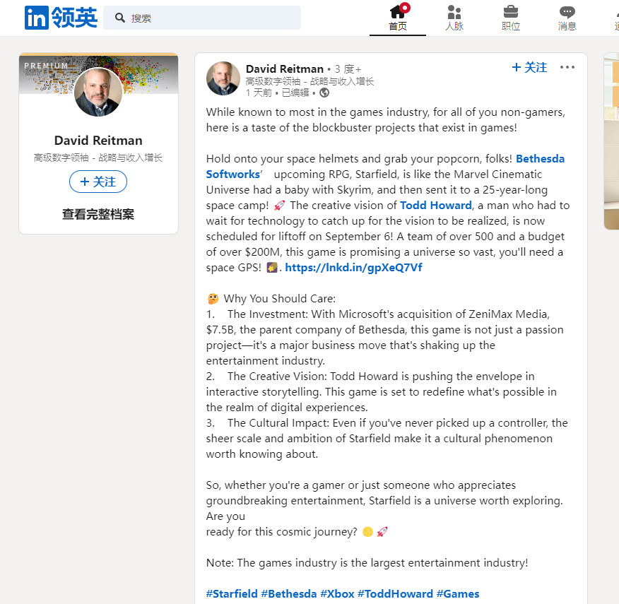 近日,根据Games Industry领导David Reitman在领英上的发帖来看,《星空》的开发人数超过了500人,同时投入了超2亿美元的资金,虽然这个数字看起来很惊人,但是对于一款3A游戏来说,并不算高。