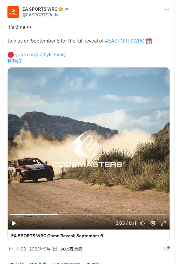 《EA Sports WRC》EA官方近日宣布游戏将会在9月5日正式公布,之前有爆料者宣称游戏会在2023年的11月3日发售,玩家拥有冠军版之后可以提前3天游玩该作,具体的信息感兴趣的玩家可以了解一下。