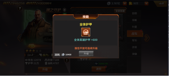 前面升战力,有两个捷径,一个是不断的获得英雄,军力等级升高,从而战力提升。第二个就是升战车,尤其是增加全体属性的战车技能等,其中全体护甲是升战力最多的。