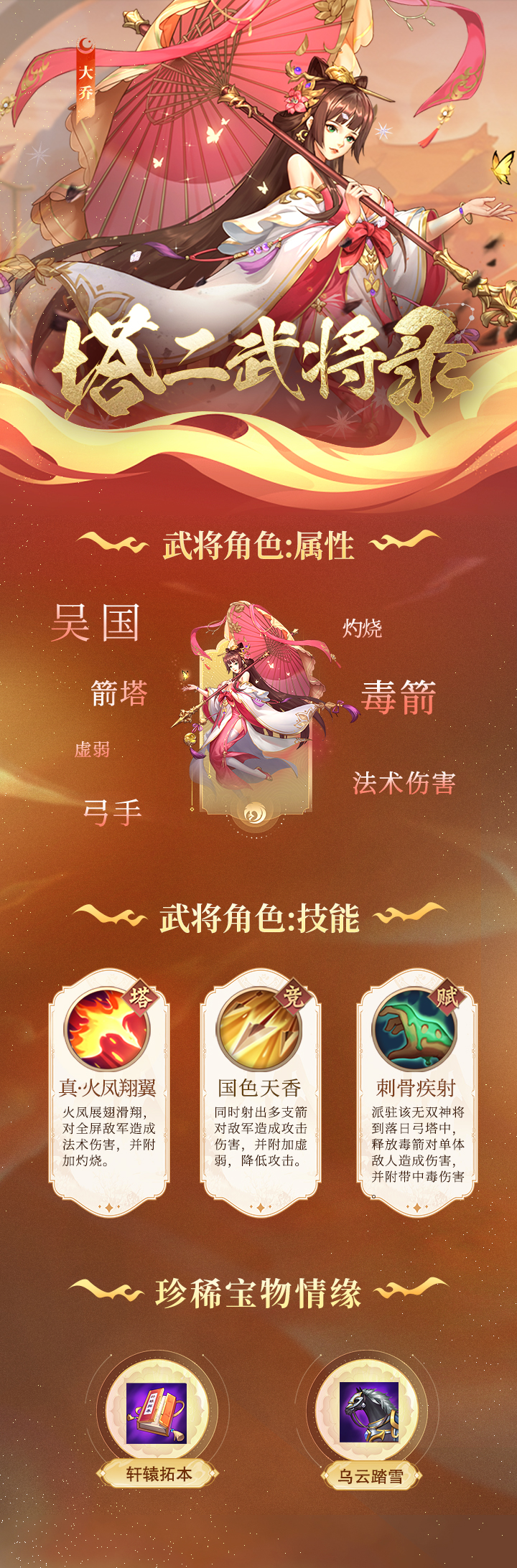 运营OS:大乔是需要无双后才能真正发挥实力的弓手,无双后对战技能效果翻倍,塔防技能在护盾关卡也有出色表现,但由于还未出专武,对于部分玩家而言前期培养性价比不高。