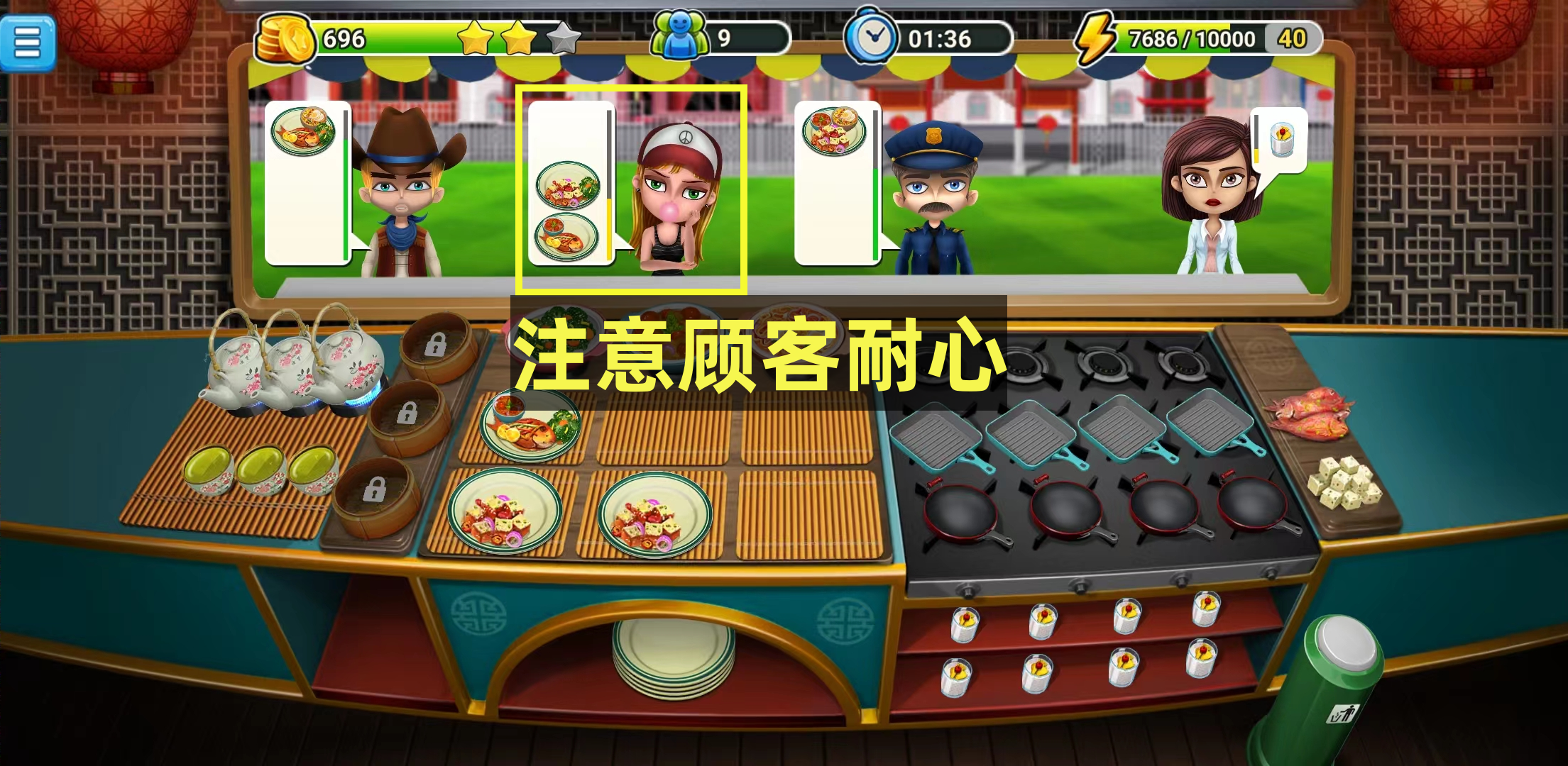 最后,要注意顾客的心情和耐心值。如果顾客等待时间过长或者服务不周到,他们的心情会下降,耐心值也会减少。所以我们要尽可能快地为顾客提供服务,保持他们的心情愉悦,达成三星任务。