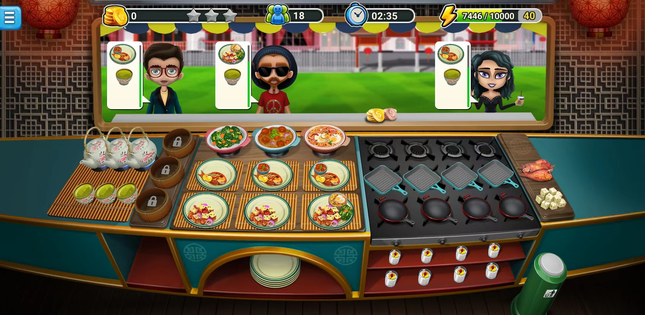 3. 茶水和蒸饺是自动制作的,蒸饺每次给顾客送完就可以点击制作了,不会做多还请放心。当菜品递送给顾客时,会稍微恢复一些耐心值,所以茶水和蒸饺可以,稍微迟一点递送,增加顾客的耐心。