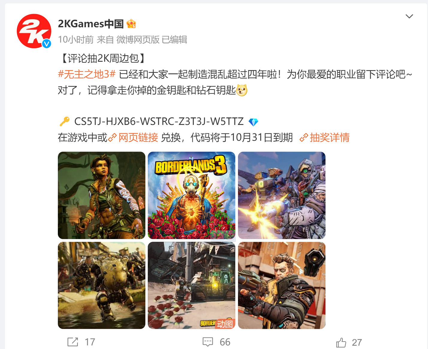 《无主之地3》作为一款刷宝射击游戏现已发售4年之久,而2K官方为了庆祝这个时间点发布了推文,同时为玩家赠送了一个钻石钥匙和金钥匙(CS5TJ-HJXB6-WSTRC-Z3T3J-W5TTZ),具体的信息感兴趣的玩家可以了解一下。