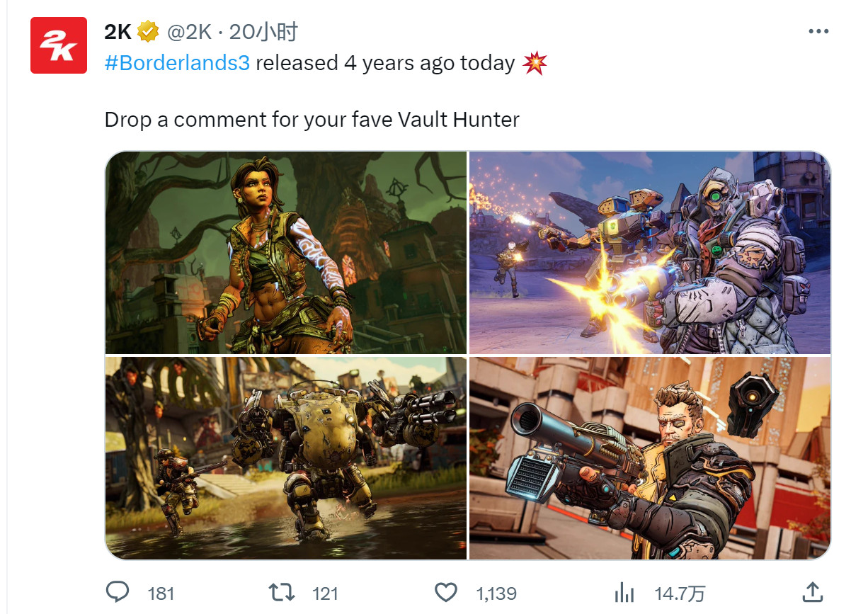 《无主之地3》是全系列首发销量最高的游戏,发售5天,销量超过了500万套。根据Take Two最近的财报,《无主之地3》当前销量超过了1800万套,但仍未超过《无主之地2》的2700万套。