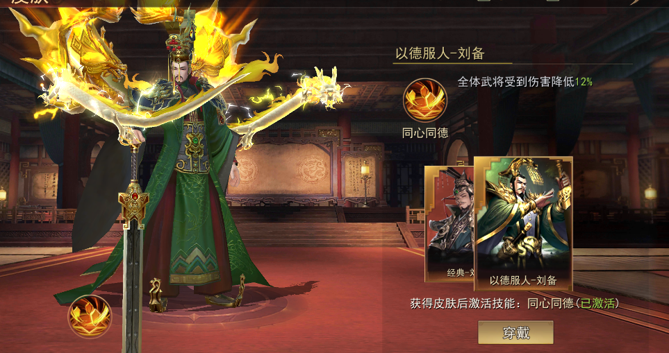 获取皮肤后激活技能:同心同德,全体武将受到伤害降低12%