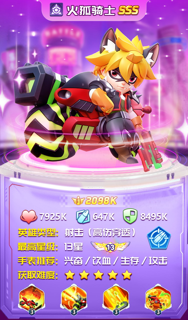总体而言,火狐骑士的各项数据都是相当优秀的,首先他有着当前版本五势力英雄最高的攻击属性,其次骑乘与非骑乘状态各提供1次免疫致死伤害,还有自身携带的吸血效果也大幅提升其生存能力,外加状态切换时可以额外获取能量的特殊增益,拥有完整且全面能力的他可以构成队伍的核心输出。不可回避的是火狐骑士始终属于射击定位英雄,纵然拥有2次致死伤害免疫和吸血也无法改变他自身生存能力存在短板的问题,只是相对其他输出英雄的生存能力要好一些。但这个短板并不妨碍他为队伍贡献出优异的输出,毕竟当前已经上线的英雄来说,除了甜心超人,暂时没有输出和生存组合能力能超越火狐骑士的英雄。