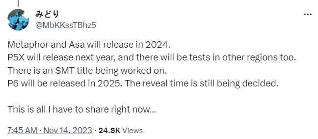 · 《暗喻幻想》和“Asa”将在2024年发售,“Asa”是一款女神异闻录派对游戏,包含了女神异闻录前五作的所有角色。