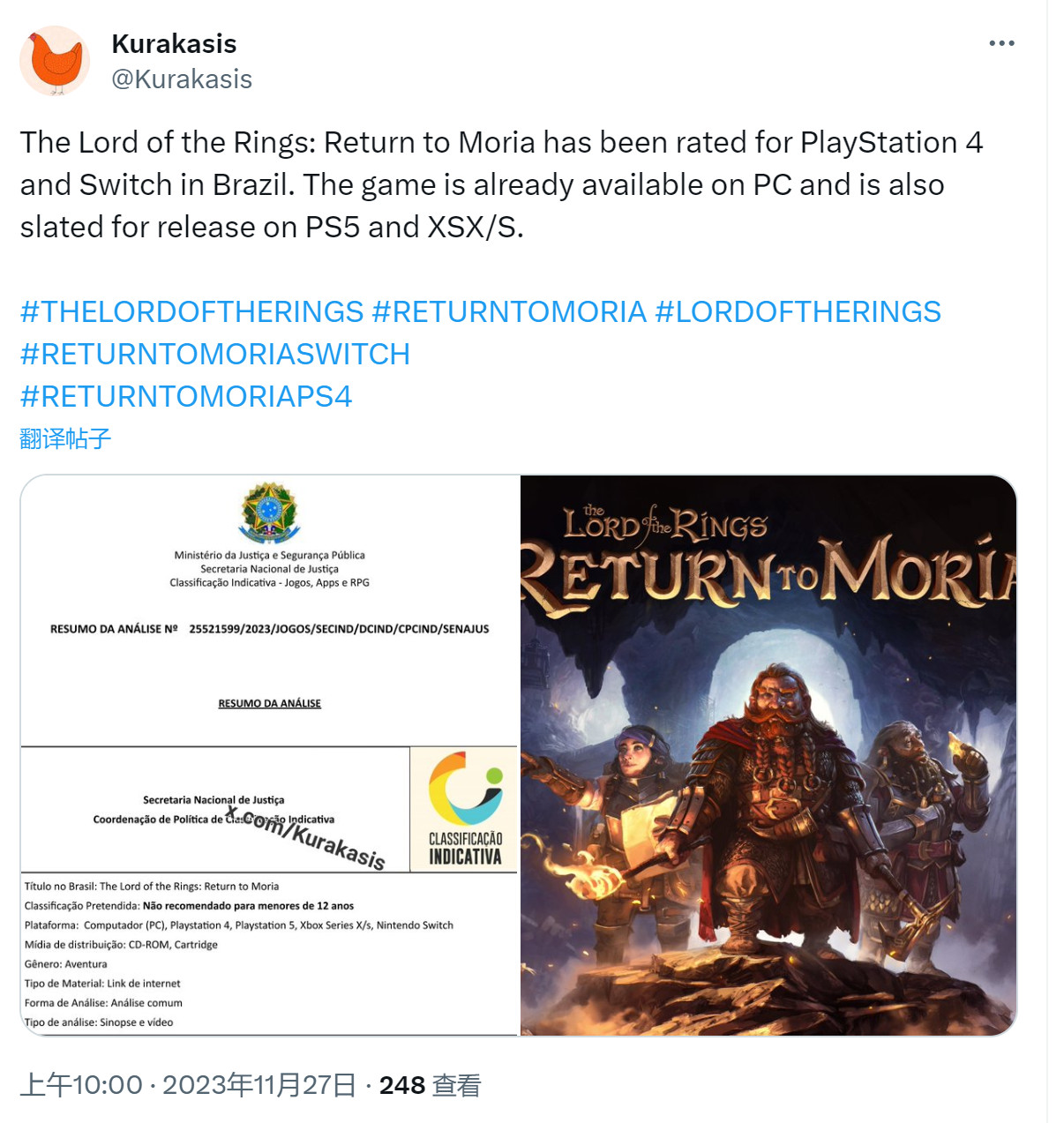 《指环王:重返莫瑞亚》近日有爆料者表示,目前游戏已经在巴西完成PS4版和Switch版的分级,这意味着该作还将登陆PS4和Switch平台。官方还没有正式公布相关的消息,游戏已经登陆过PC平台,未来计划上线PS5和Xbox Series X|S平台。