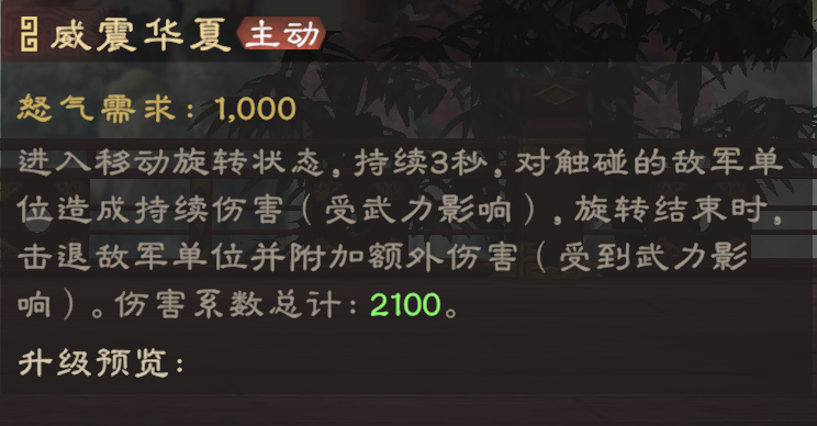 威震华夏可旋转对触碰敌军造成伤害,旋转结束后可造成击退,由于关羽的武力成长较高,所以能通过主动技打出较高伤害。关羽的技能系数较高,但相比于常规技能系武将,缺少暴击乘区,要通过持续作战下的反击伤害来提升伤害总量。