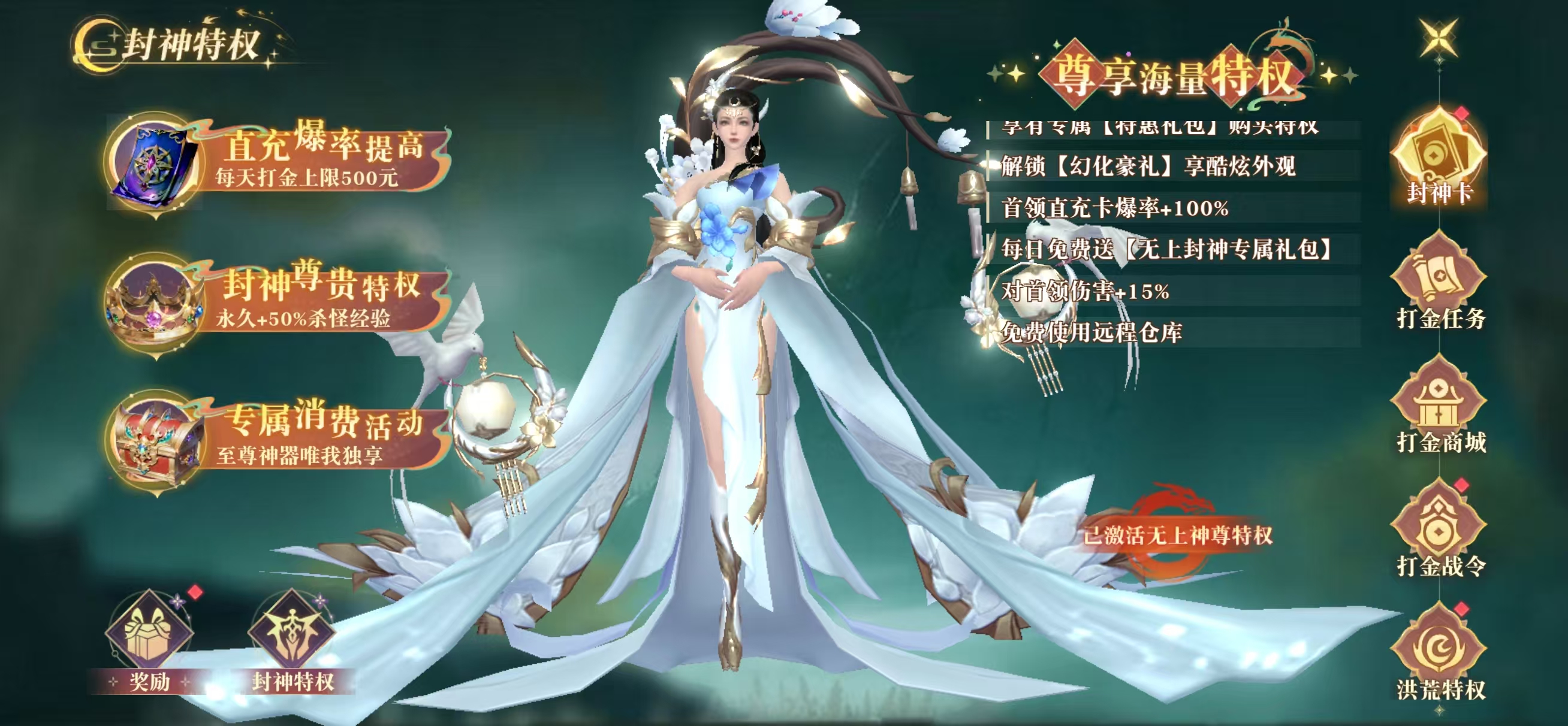 永久增加经验获取百分比-50%,还可提升免费储值额度上限,另有元宝、外观、礼包、提升首领伤害等尊享特权,强推!