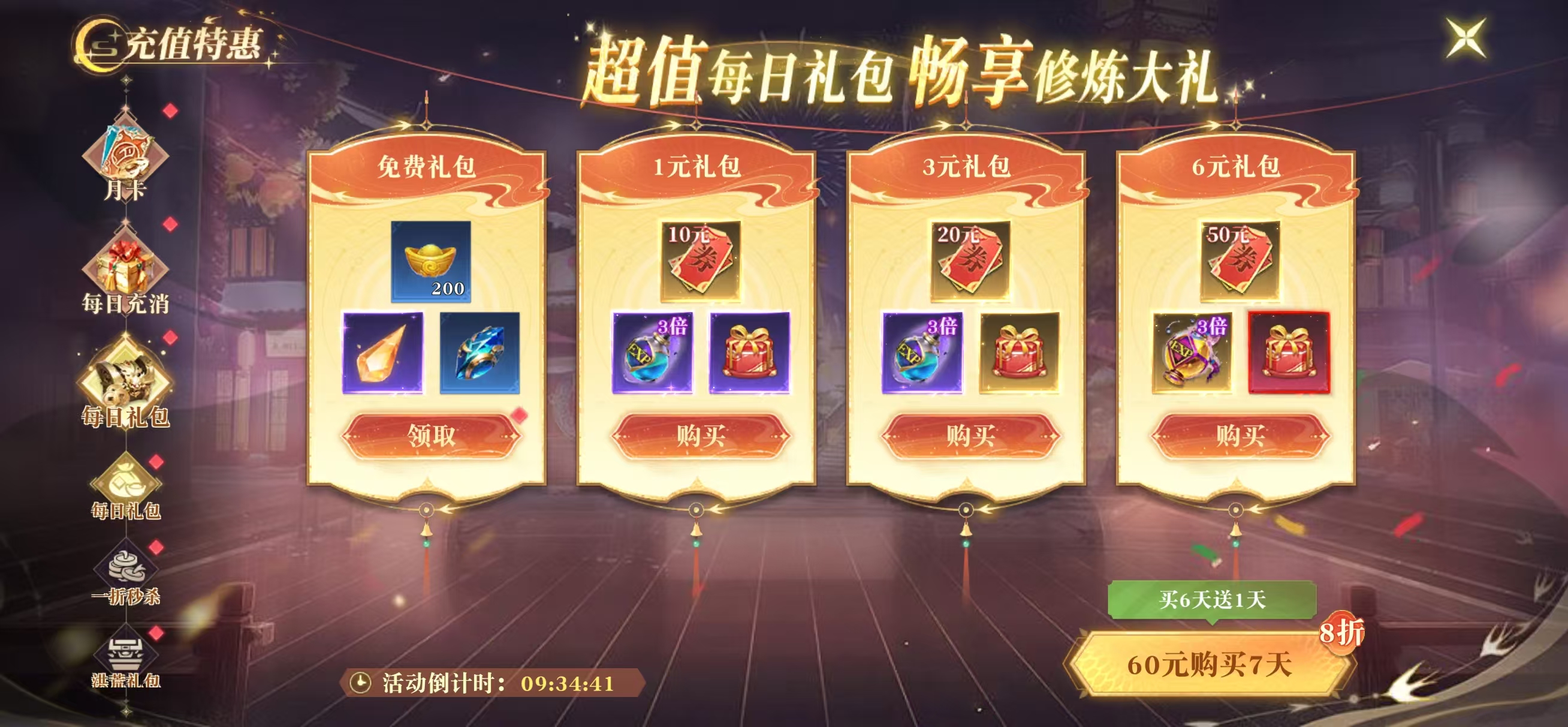 每日刷新礼包,包含充值修炼药水,每日精选礼包等,买6送一,冲榜必买。