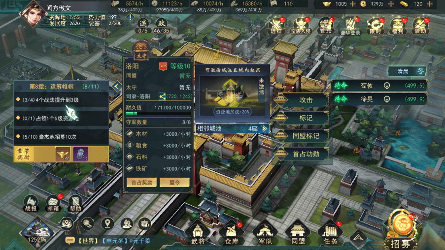 玩家通过占领相邻城池,逐步向关隘和资源州、司隶进军,最后能夺取洛阳的同盟,将成为全服最强的同盟。