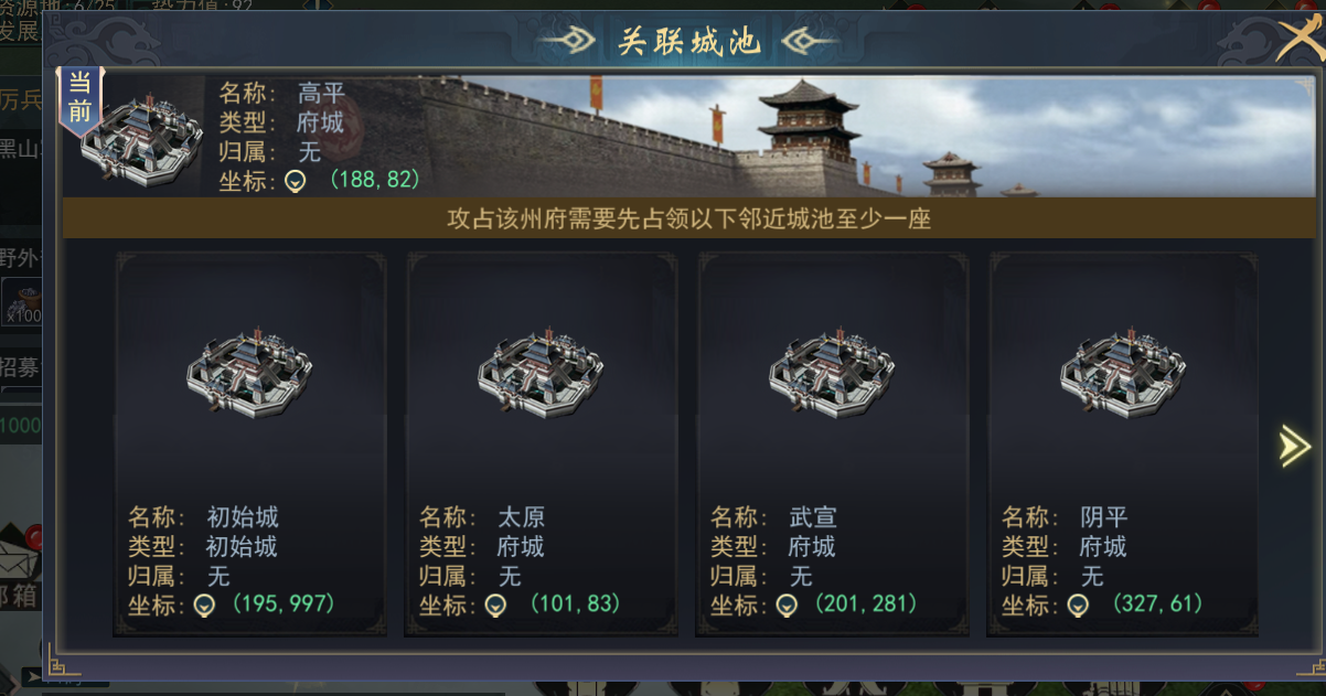 当玩家成功占领1级城池后,玩家只能攻占1级城池区域线相邻的城池。比如初始城池和2级城池通过地界线相邻,则能攻占2级城池,若不相邻,则无法攻打。